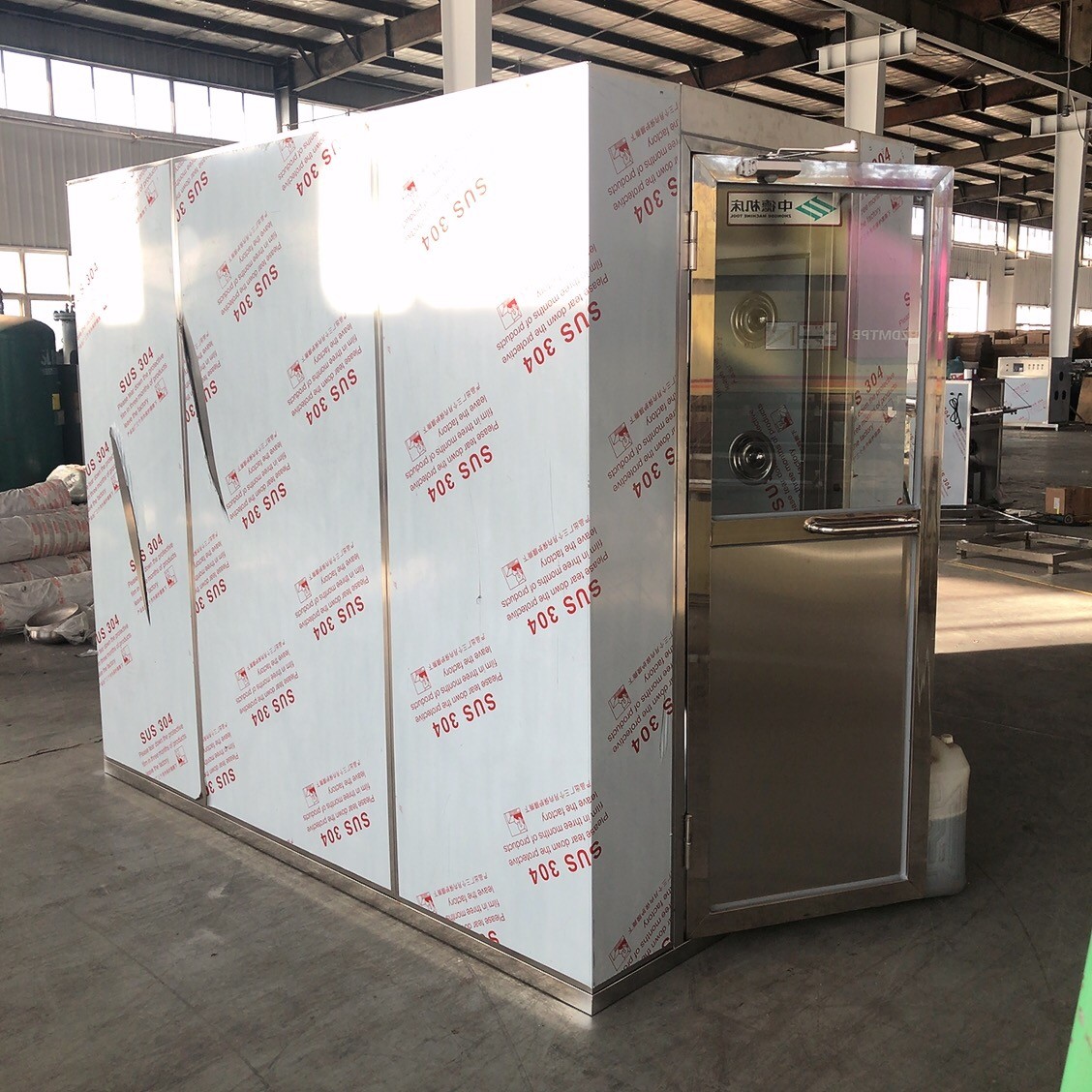 4采用全不銹鋼制造門、門框、拉手、加厚地臺(tái)板、風(fēng)淋噴嘴作為基本配置。